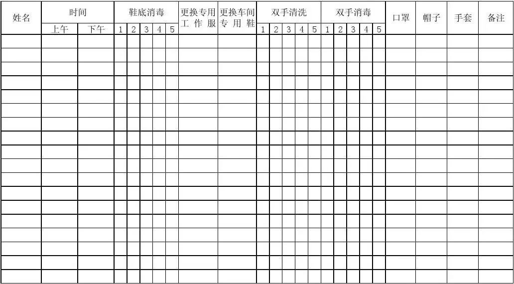 总结:工作人员保持手的卫生,不应有可见创口,手套也是必不可少的,带上手套后,应将手套的手腕置于衣袖内,以隔绝污染源。一般来说,要满足万级净化车间标准的要求,手套要勤洗勤换,如有损坏立即更换。另外消毒表把顶部的标题写好,需要用到的内容写出来,再留出签字地方,就是一张完整标准的记录表了。