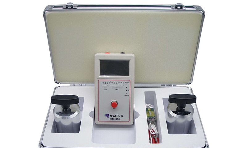 1、仪器的高压输出端与测量输入端分别与两个电极相连接(屏蔽端空置不用),将导电橡胶按标准要求相隔一定距离置于被测试样表面,电极放在导电橡胶上。